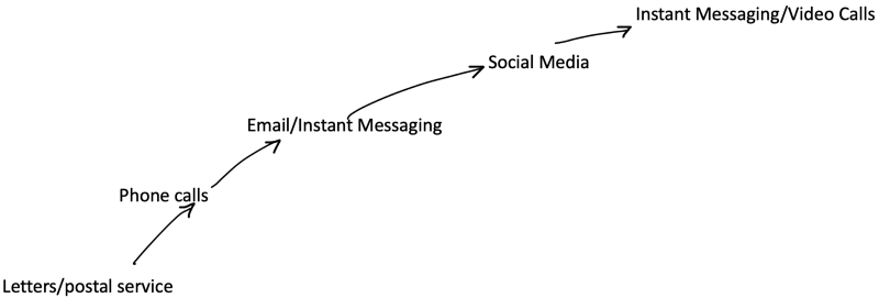 🌈 I have been thinking about the arc of communications tech — especially in how we communicate with family and friends (and did/will communicate). That arc, in my head, mostly goes like this picture below: