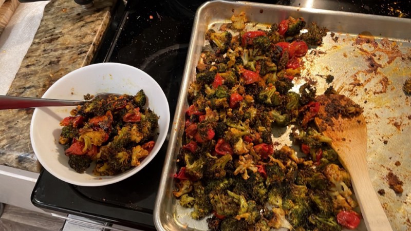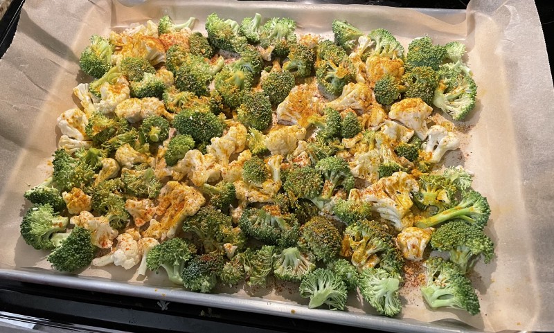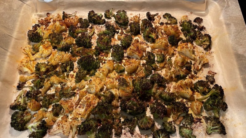 Essentially, you are looking for a nice golden bake on the cauliflowers and a partial browning of the broccoli.