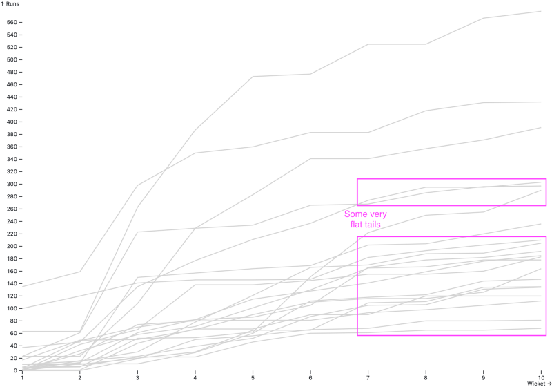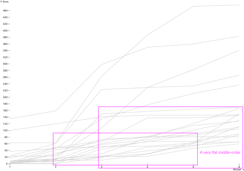 By the time you lose the 5th and even the 6th wicket, you expect to start with the tail of the batting line up. So really, we should be focused on region between wickets 2 through 5. And it is still not a pretty picture. You certainly see some fight at the 2nd and 3rd wicket marks, but the lower-middle order is just giving up.