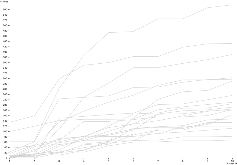 And I plotted the fall of wickets for every English batting innings from all those tests: they total about 21 batting innings.