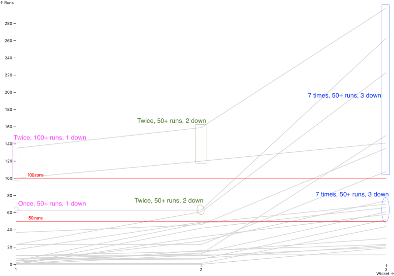 - Getting slightly more for that 3rd wicket: 7 times England were above 100 runs at the loss of 3 wickets; 7 times England were below 50 runs, and 7 times between 50 and 100.