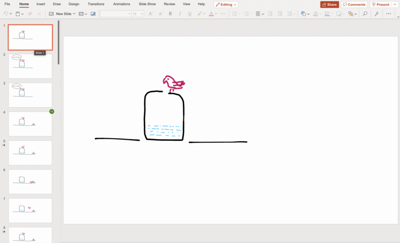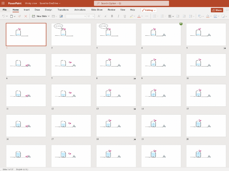 I am not going to touch upon why I did it, but I wanted to animate a well known short story. And, “The Thirsty Crow” came to mind immediately. I had no intention of spending any money on the Adobe Creative Suite. But I do/did have a personal M365 subscription, and PowerPoint installed on my Mac. Moreover, I have had some experience with using animations and inking on Powerpoint for Mac — but for slide decks at work. I figured that this was just a short story, and so, I rolled up my sleeves and produced this: