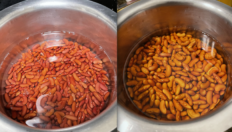 Here is what the rajma looks like at the start and end of a 6 hour soak: