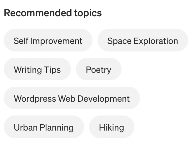 It still overfits on stuff related to software. Like in the picture above, you can see stuff like “Data Analytics”, “Customer Experience” or even “Wordpress Web Development”. But at least now, I get suggestions like “Poetry” or “Space Exploration” or “Healthcare”.