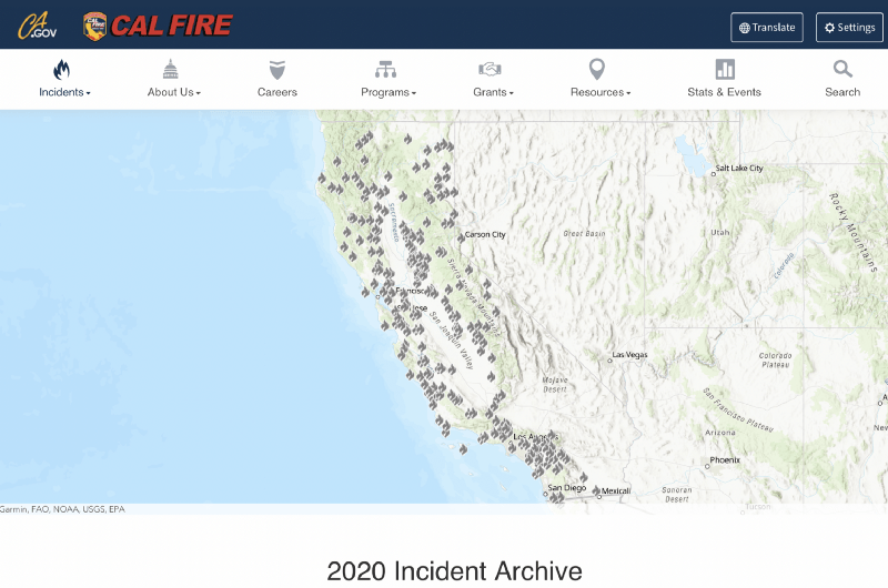 Cal Fire’s 2020 Archive page maps fires that happened across the state and the archive runs into 26 pages, totaling 258 fires that happened during 2020 ranging from 1,032,648 acres to 2 acres. Wikipedia lists about 74 fires in California in the year 2020 (ranging from 1,032,648-to-705 acres).