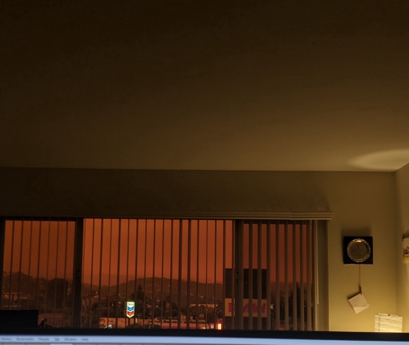 The way I understand it, there was a flux of fog from the Pacific Ocean (remember, this is called the Bay Area for a reason). This fog created a blanket that prevented the smoke from reaching the surface (earth’s) — which kept the AQI under control and gave us breathable air for one day. But this also created a thick layer of fog and smoke in the atmosphere over the Bay Area that diffused sun light — permitting only the longer wavelengths of light (think red/orange) to reach the surface, thus creating a natural sepia filter.