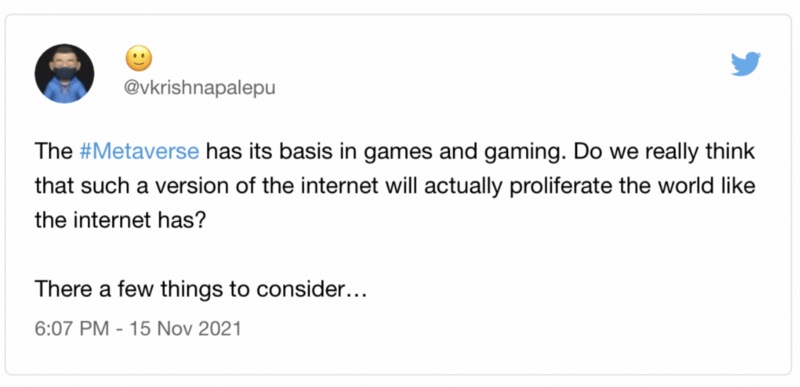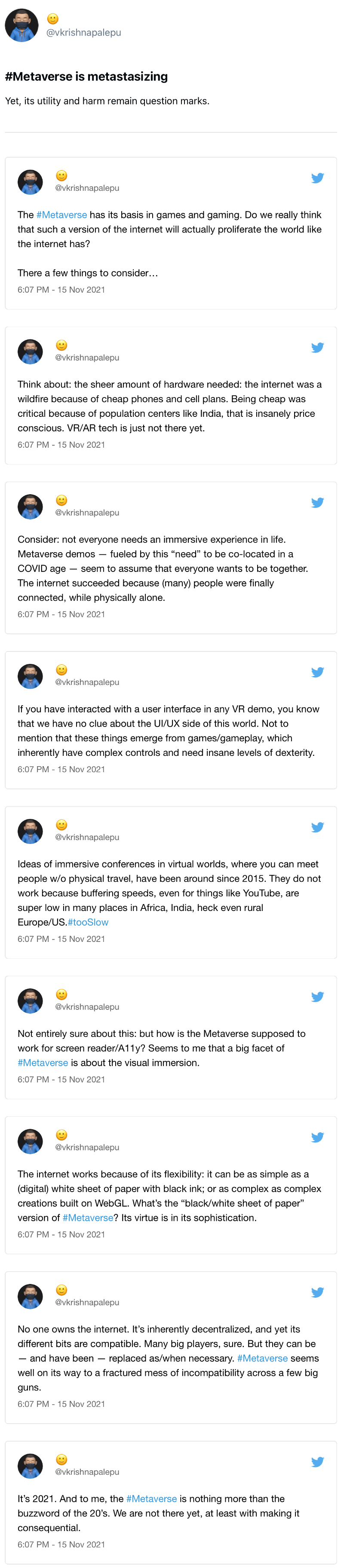 I hope I am wrong. Because like it or not, the Metaverse is coming. Of course, as I call out in my original Twitter thread, I think (and hope) that it will be technologically unworkable.