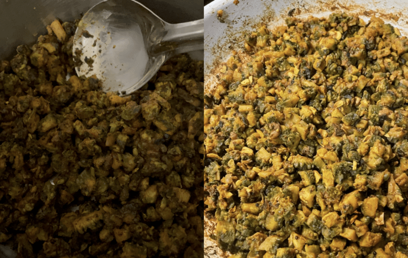 Stir frying has one clean upside: it reduces the bitterness of the final dish. But along with the bitterness, it also burns up most of the nutrient that karelā is rich in! Also: the dish looks a lot richer and feel sumptuous when steam cooked. Below, look at the side-by-side comparison of the fried vs. steamed version of the dish.