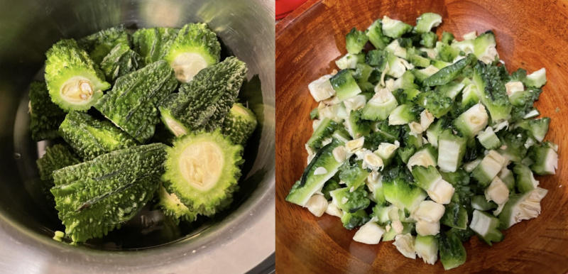 Just like with the green beans, it can take a little longer than 20 mins to cook, so I keep checking-in every 10 mins. The key indicator that the cook is nearing completion is when the pieces of the bitter gourd just start to loose color.