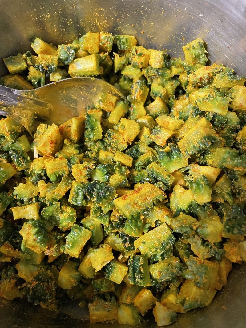 Step 2: Spice the chopped karelā/bitter gourd