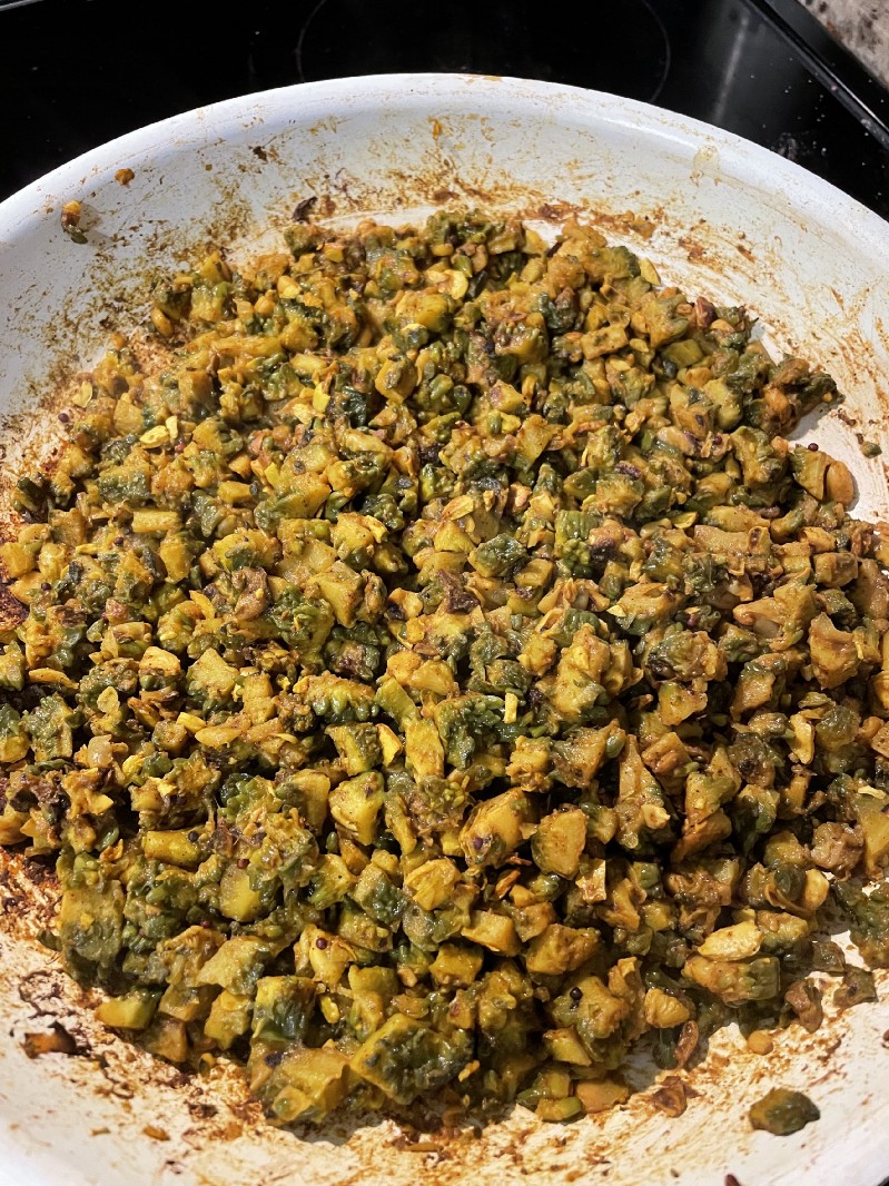 Notice how the pieces of the karelā/gourd are still green. They have not turned brown or black — which can happen when you stir fry it instead of steam cooking.