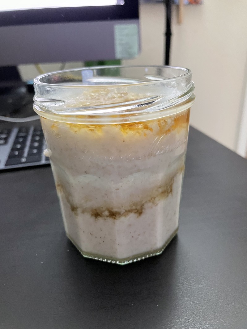 Finally, I took a tumbler in which I wanted to enjoy this porridge, and added in some honey — in layers if I may say so: one layer of porridge, one layer of honey, followed by porridge, and then one last layer of honey. And I was off to my desk ready to enjoy my porridge as I started answering the morrning batch of work emails.