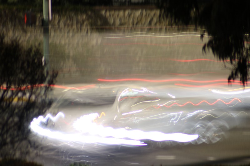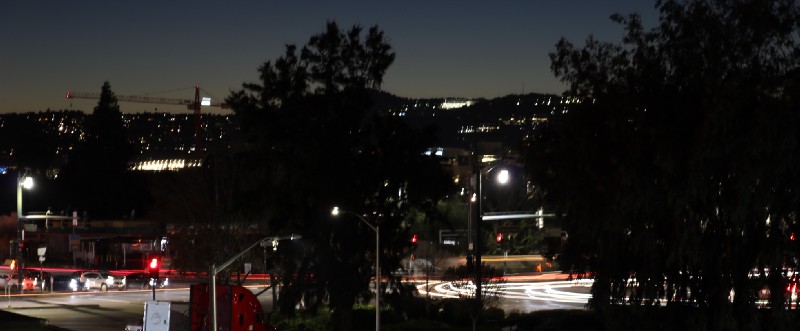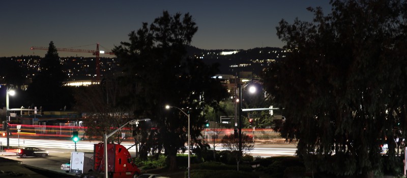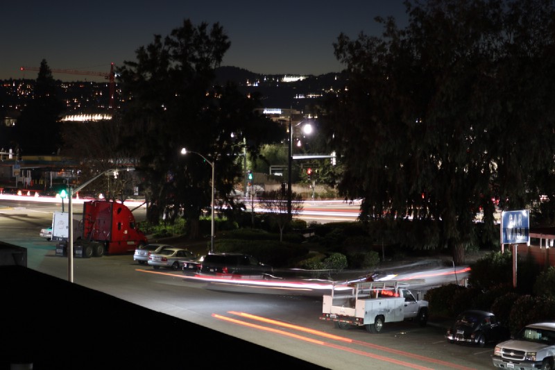 The pictures above zoomed in on a very small part of the traffic intersection. I originally started clicking the long exposure shots of this intersection, without any zoom. The streaks of light seem to have a life of their own, especially when contextualized within an environment of stationary objects: trees, street lights, parked cars and trucks, cranes and hills.