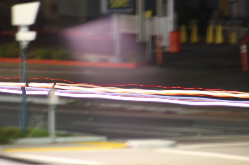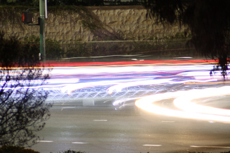 “Traffic Waves” — Somehow, the camera was able to focus on the streaks of red, white, blue and pink — from the taillights and headlights of moving traffic. And as it brought those streaks into focus, it somehow blurred everything else in the background.