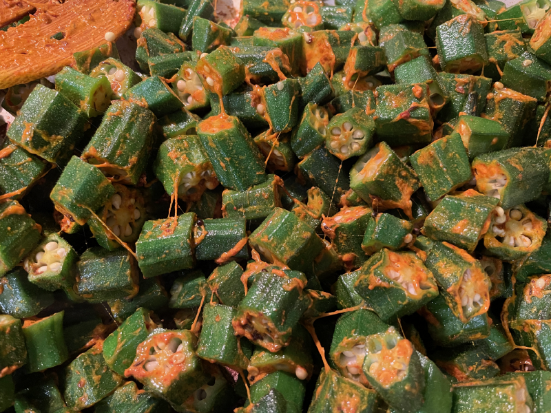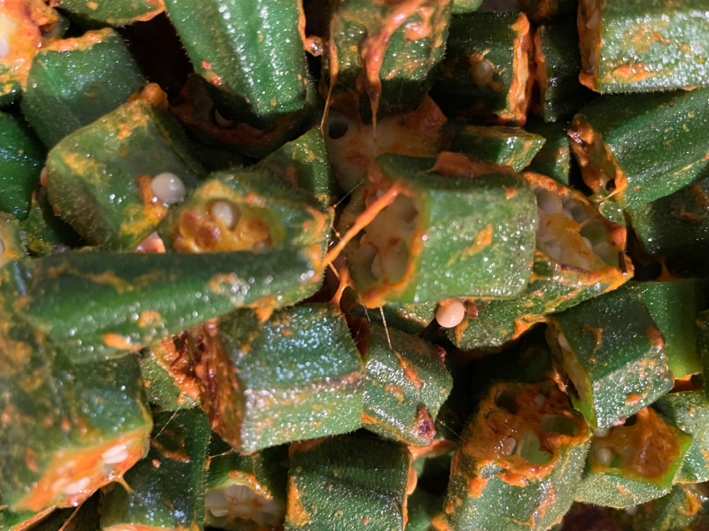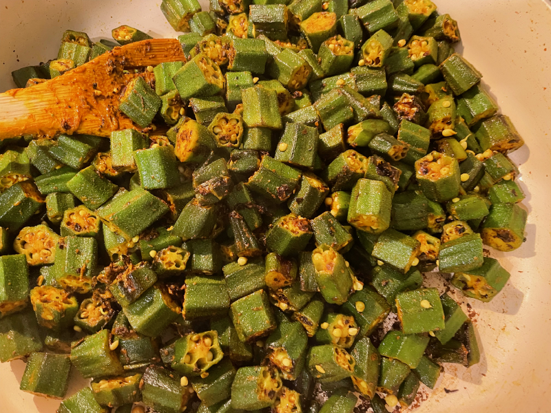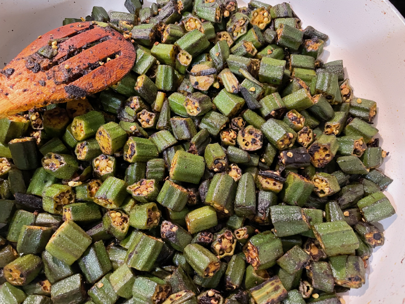 Note how the final form of the fried okra still has its bright green color. It is starting to lose its color a bit here and there, and that is how I knew that it was time to turn off the flame. Now, obviously I taste my cooks to check if the food actually cooked, and then I turn off the heatāāāso thatās helpful too.