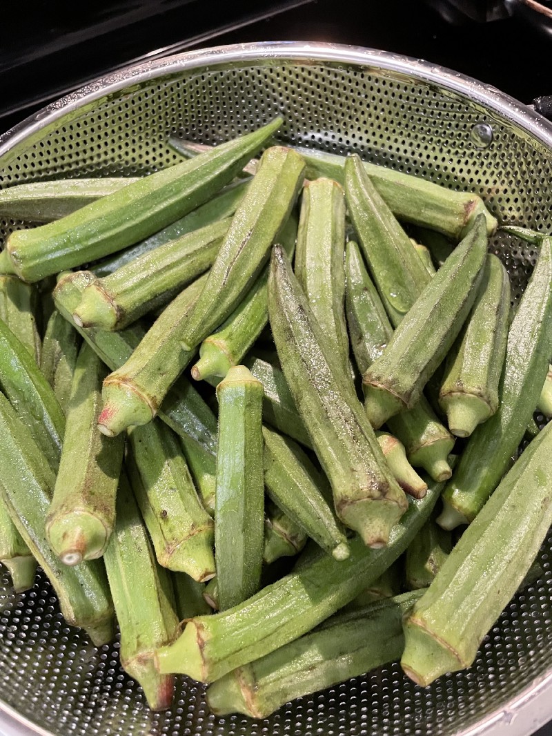 So, first cleaned the vegetable in my colander. When you buy okra, do not be bashful. Buy a big bag full of it. If you want to cook half-a-pound, you probably want to buy one pound. It is a vegetable that shrinks dramatically when you cook it.