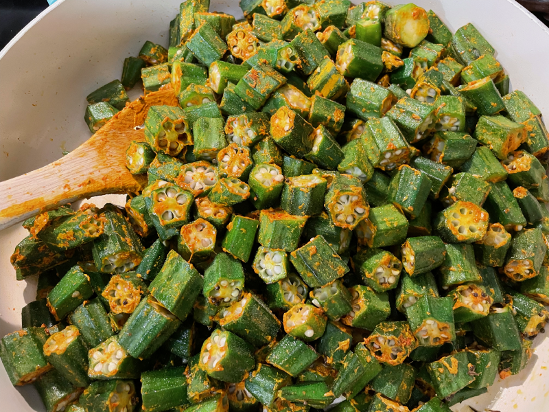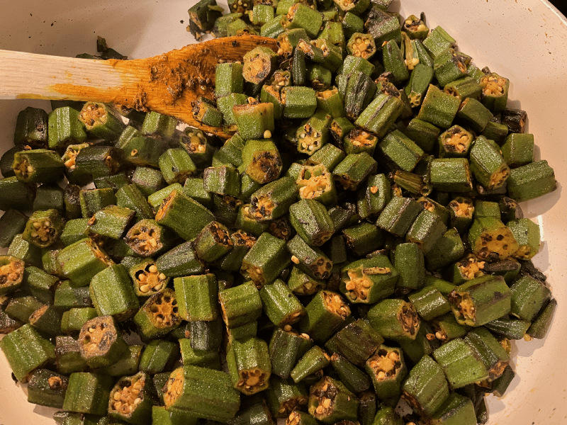 Second, it is important to not overcook the vegetable. You know that you are starting to overcook it as the okra starts to loose its bright green color.