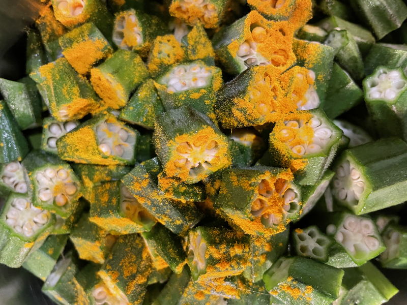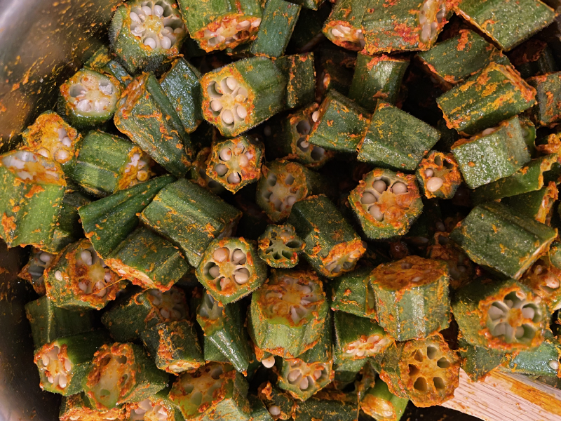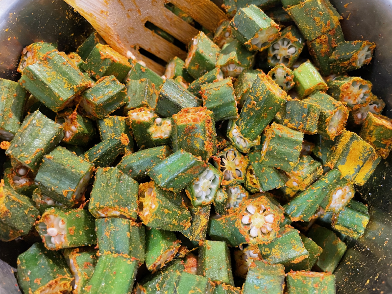 Once I was done with the spicing, I dashed the chopped, spiced okra with some sunflower oil. Adding the oil before the cook actually binds the spices to the vegetable and coats the okra evenly with the oil. The even spread of oil and spices allows for a relatively even cook.