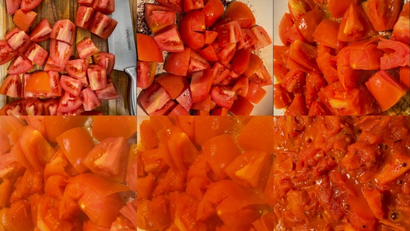 While the cooker did its business, I moved to make the tomato purée. Again, the concept here is pretty simple: cut the tomatoes into chunks so that they retain water, and toss them into a pan with hot oil (after crackling mustard seeds and cumin in the hot oil). The heat causes the water in the tomatoes to burst out and in turn cook the tomatoes into a nice, thick purée.