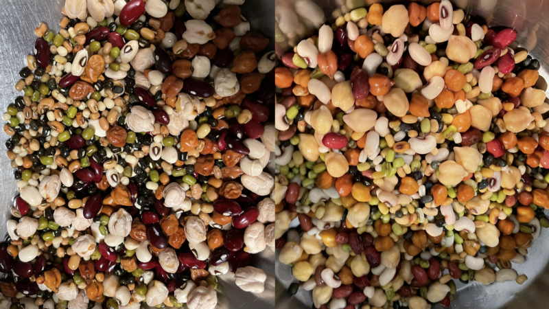 … they clearly soaked up the water, pretty well! Below are some shots of the lentils before/after the soak. The chickpeas and kala channa visibly soaked the water well. This was turning out nicely so far.