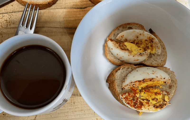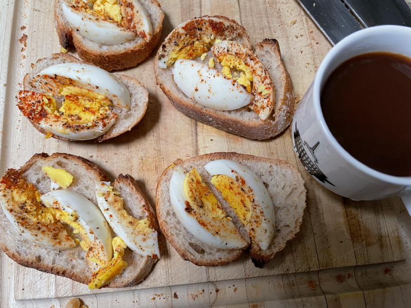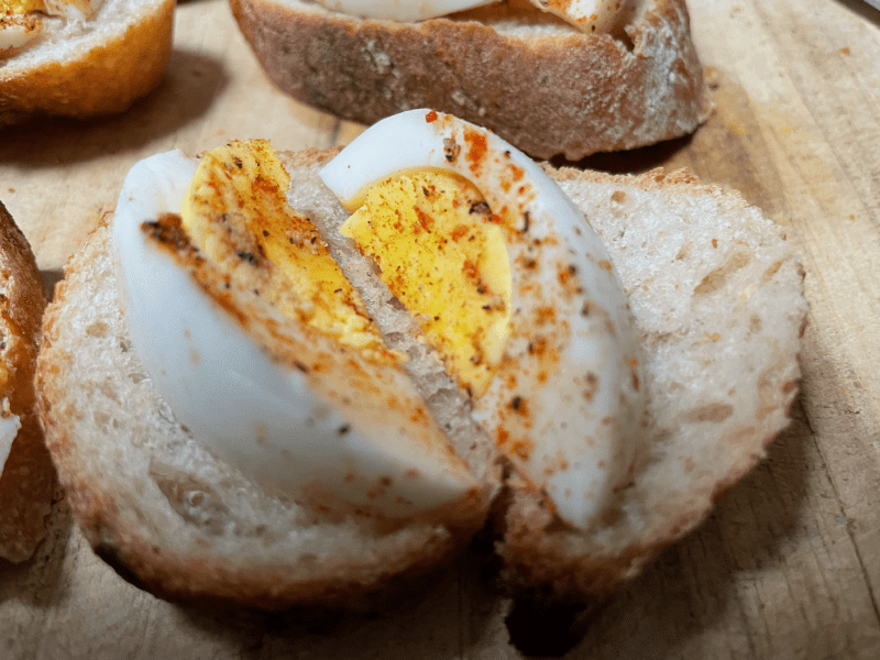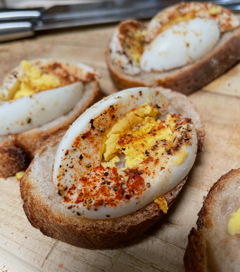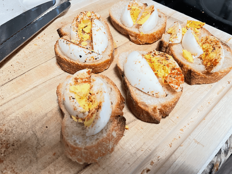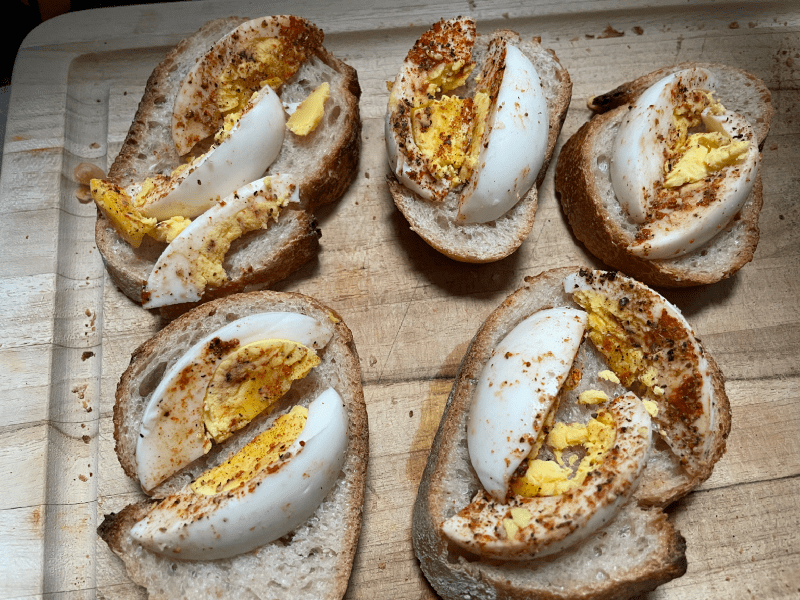 Specifically, slices of boiled egg on slices of sourdough baguette.