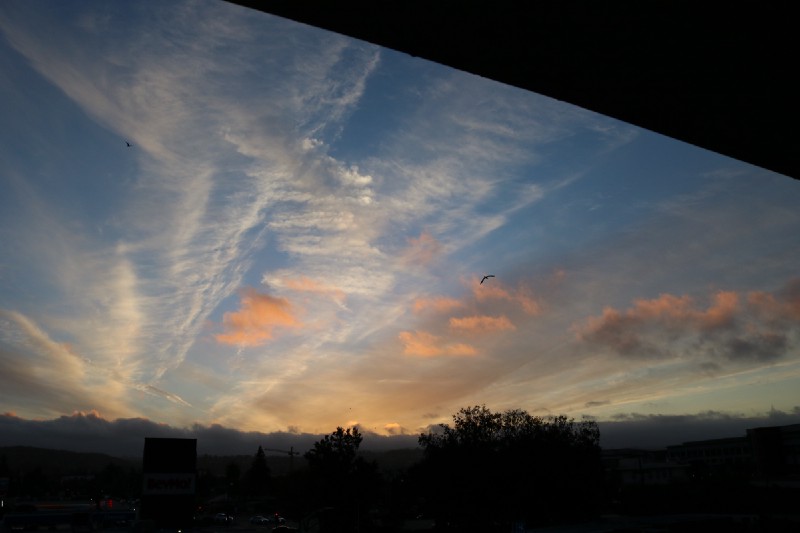 I caught a couple of different shots of this view of yesterday’s sunset. But only the shot above clearly shows those two birds flying around.