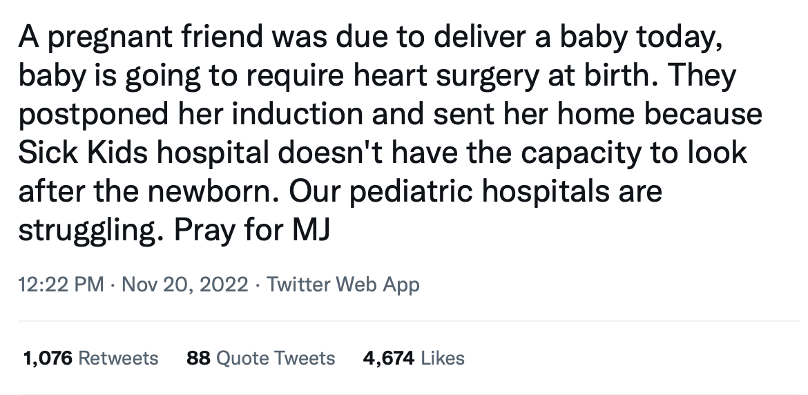 And when you fail to adopt such inconvenient public health measures, you get to situations like spelled out in this tweet from Nov 20 2022: “A pregnant friend was due to deliver a baby today. Baby is going to require heart surgery at birth. They postponed her induction and sent her home because Sick Kids hospital doesn’t have the capacity to look after the newborn. Our pediatric hospitals are struggling.”