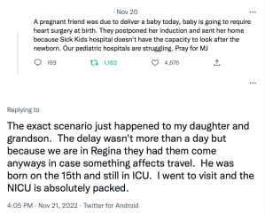 Here was a response to that tweet: “The exact scenario just happened to my daughter and grandson. The delay wasn’t more than a day but because we are in Regina they had them come anyways in case something effects travel. He was born on the 15th and still in ICU. I went to visit and the NICU is absolutely packed.”