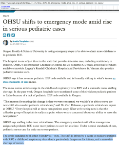 “The crisis standards took effect Monday at 7 p.m. The shift is driven by a surge in pediatric patients with RV, a childhood respiratory virus that is particularly dangerous for infants, and a statewide shortage of nurses.”