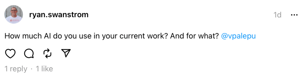How much AI do you use in your current work? And for what? [Threads] [Web Archive]
