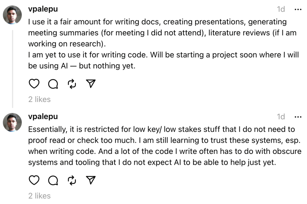 I use it a fair amount for writing docs, creating presentations, generating meeting summaries (for meeting I did not attend), literature reviews (if I am working on research). I am yet to use it for writing code. Will be starting a project soon where I will be using AI — but nothing yet.