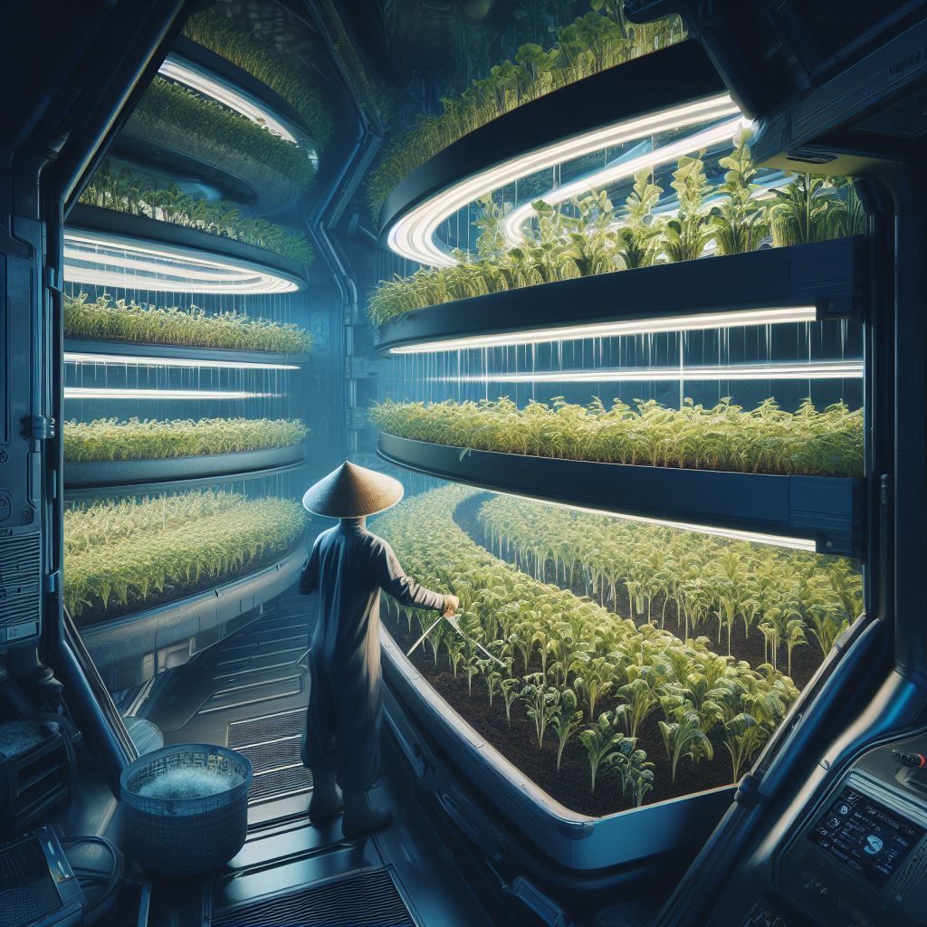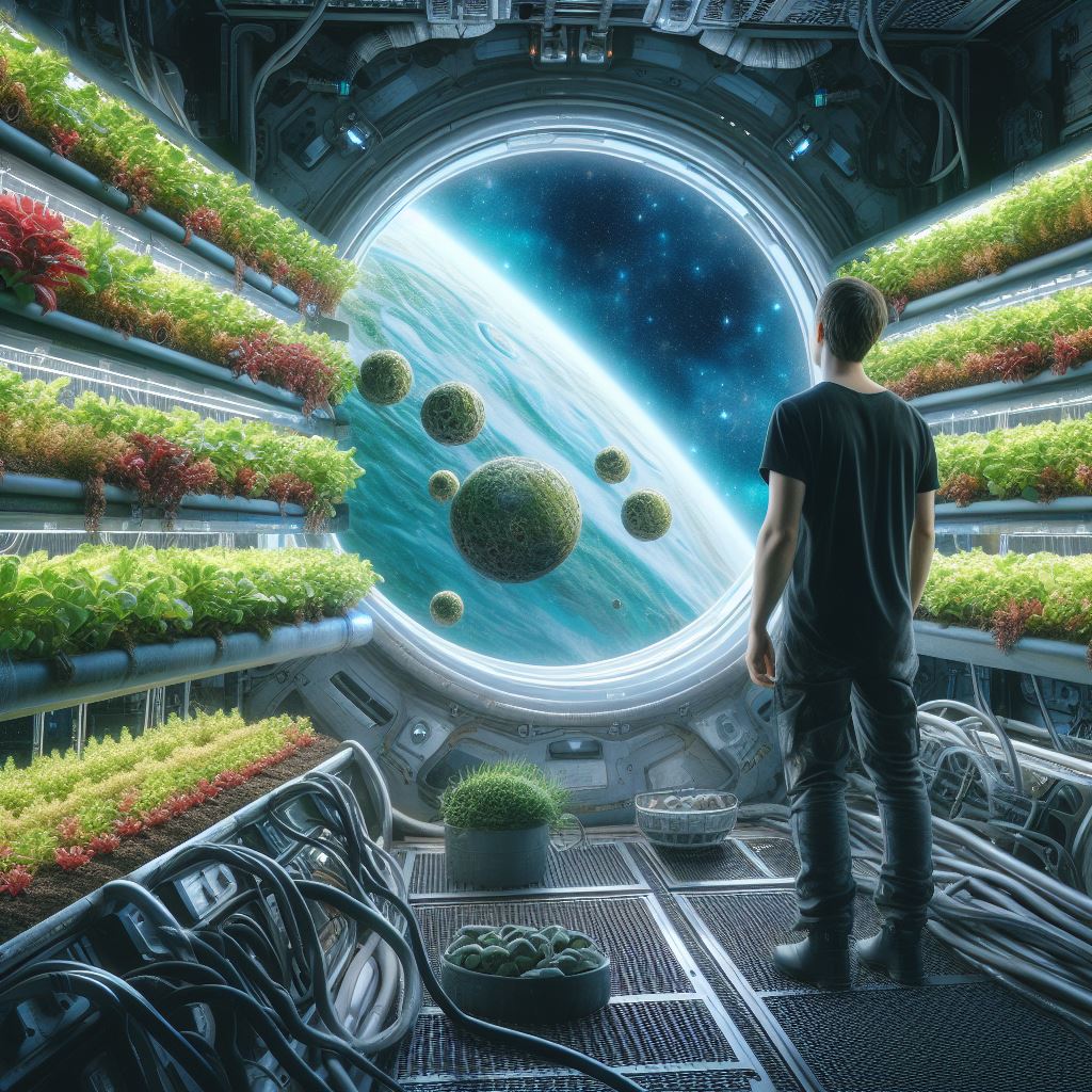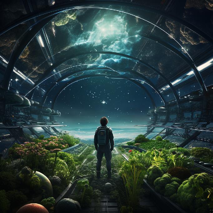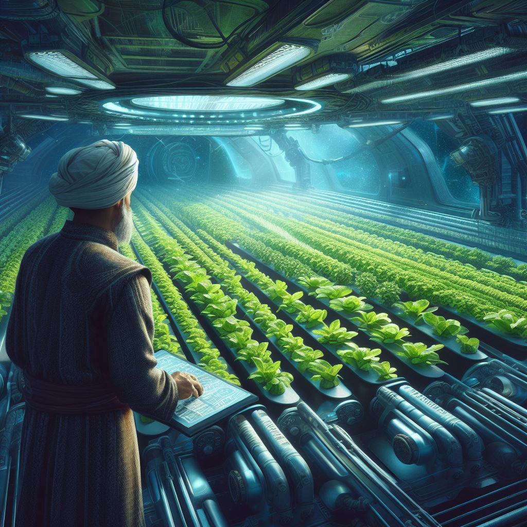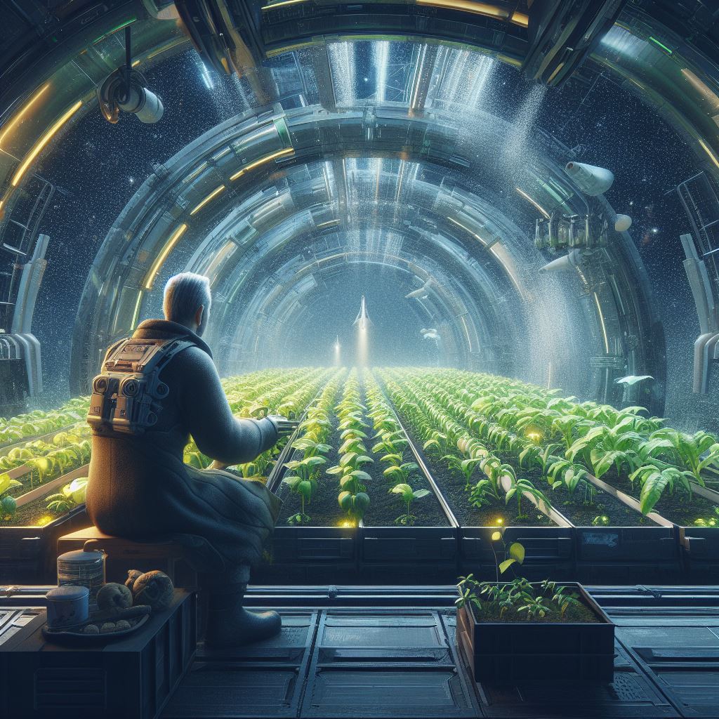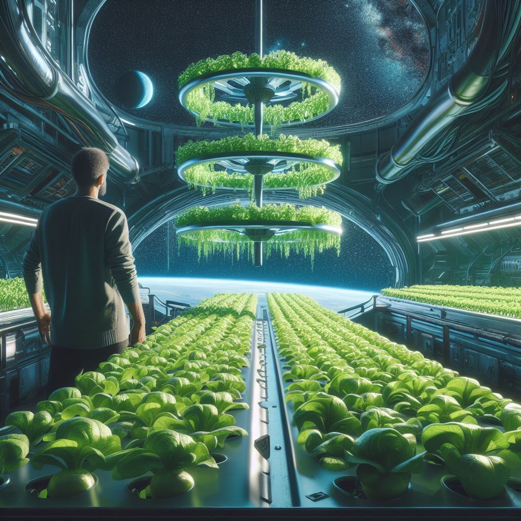 Bing Prompt: Generate an image of a farmer in space, looking over his crops, the crops are growing in a hydroponic system inside a spaceship or outer-space station. Futuristic, sci-fi, digital art, hyper detailed.