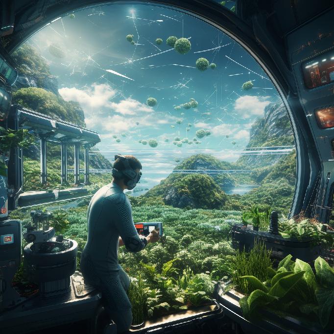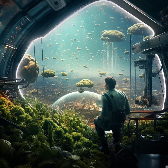 Midjourney Prompt: /imagine a farmer in space, looking over his crops, the crops are growing in a hydroponic system inside a spaceship or outer-space station. Futuristic, sci-fi, digital art, hyper detailed.