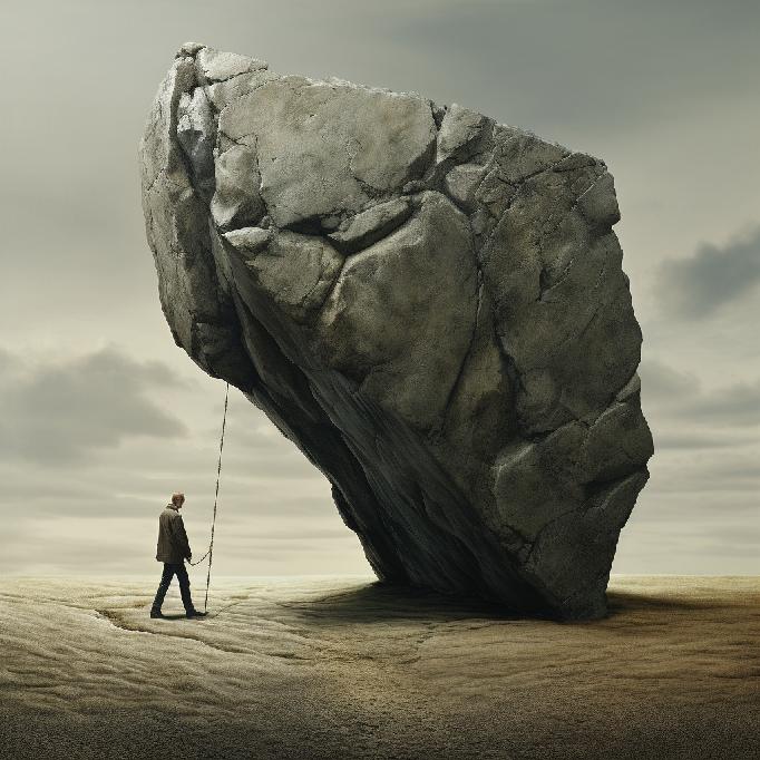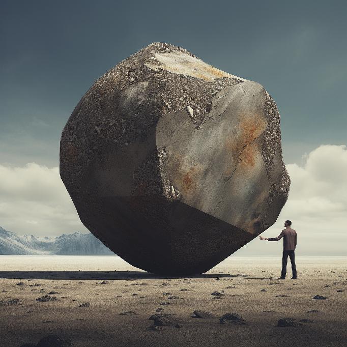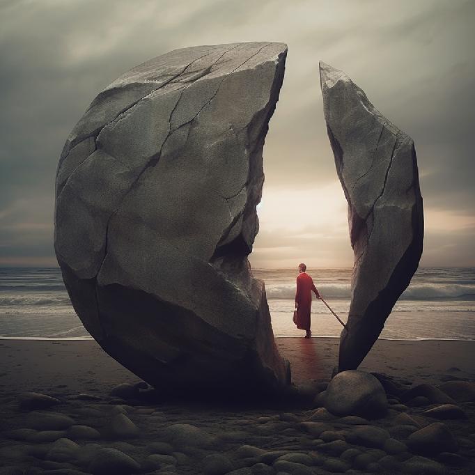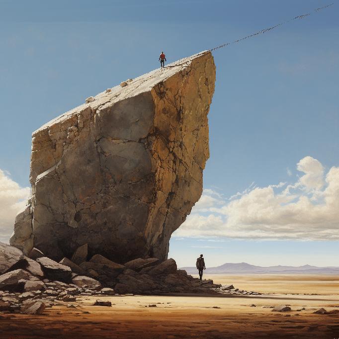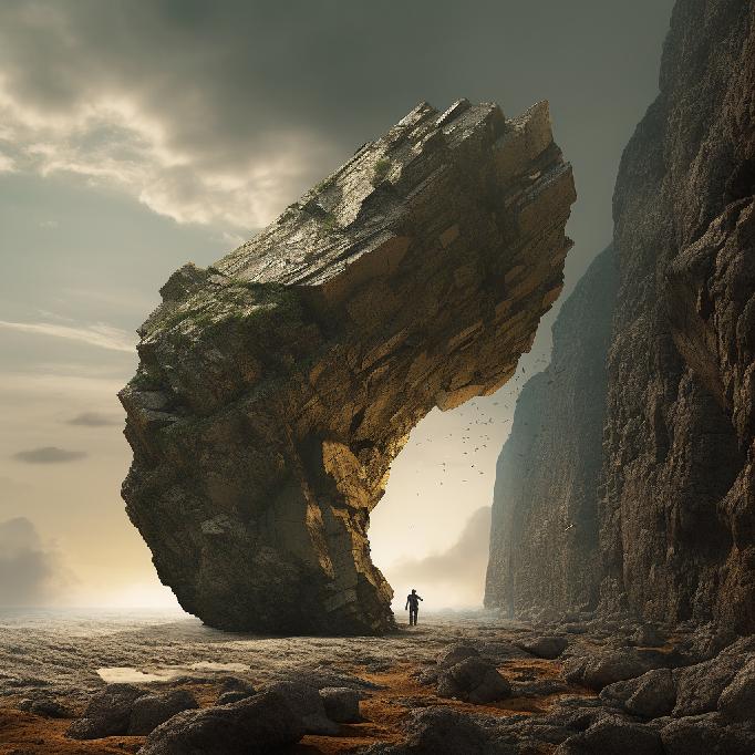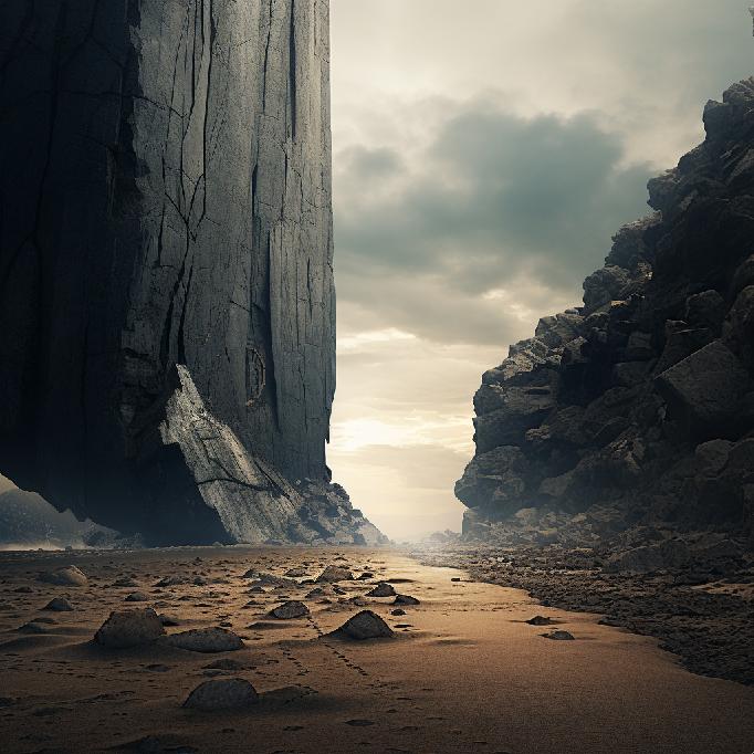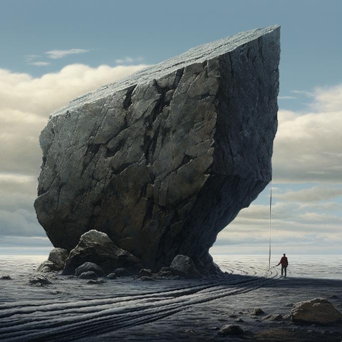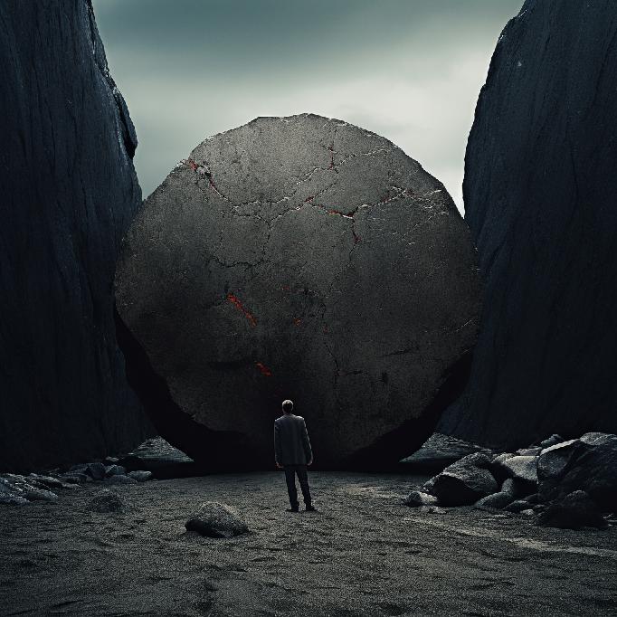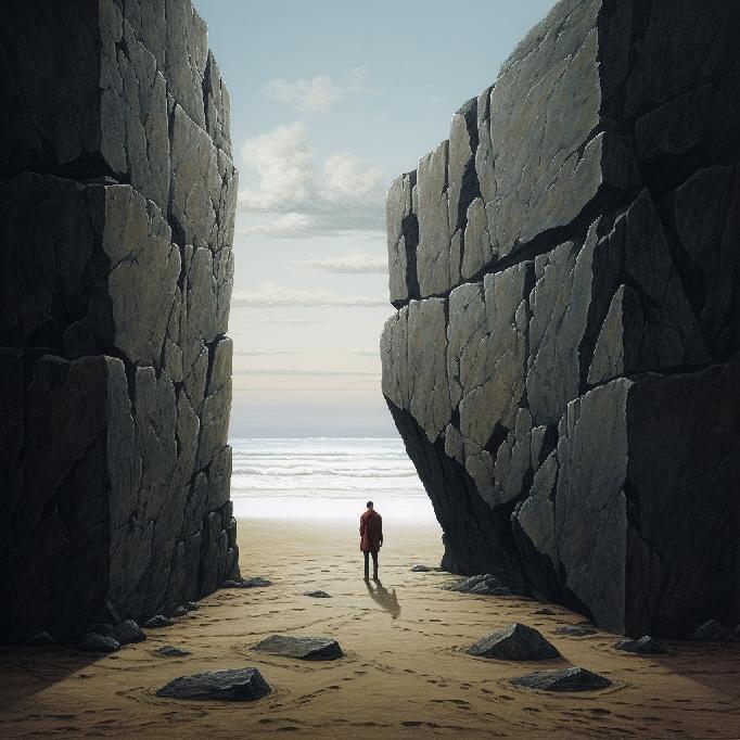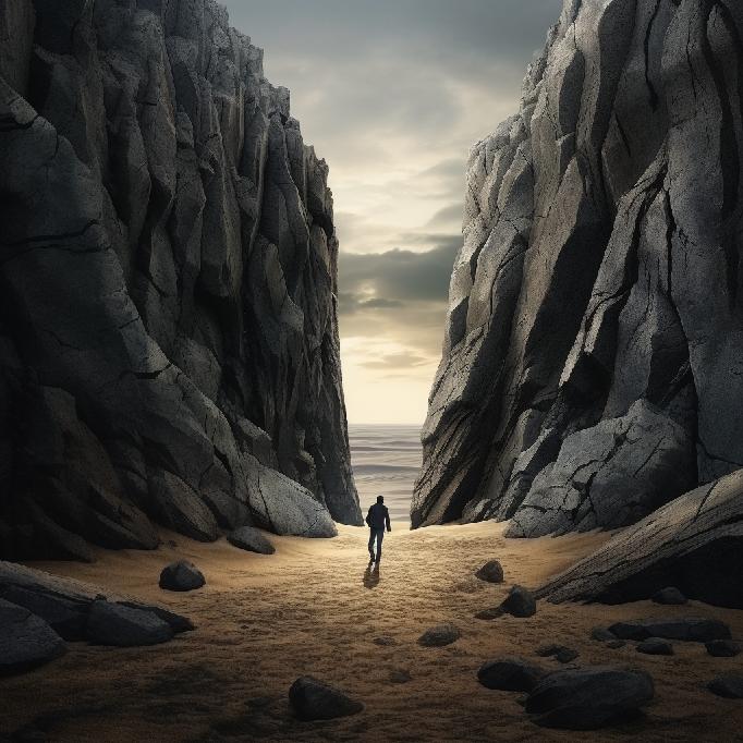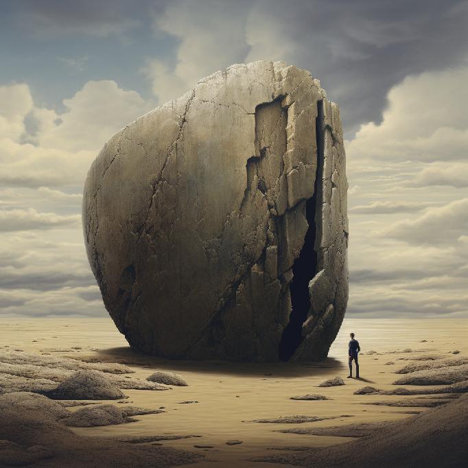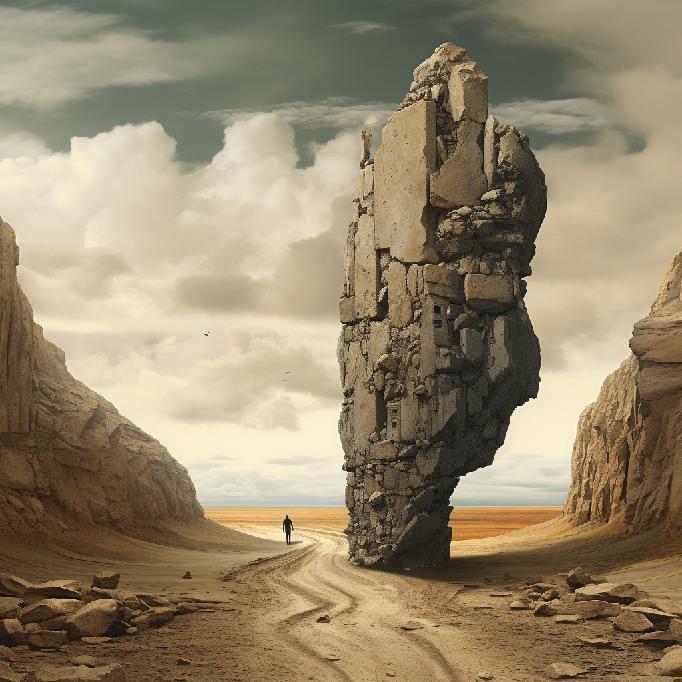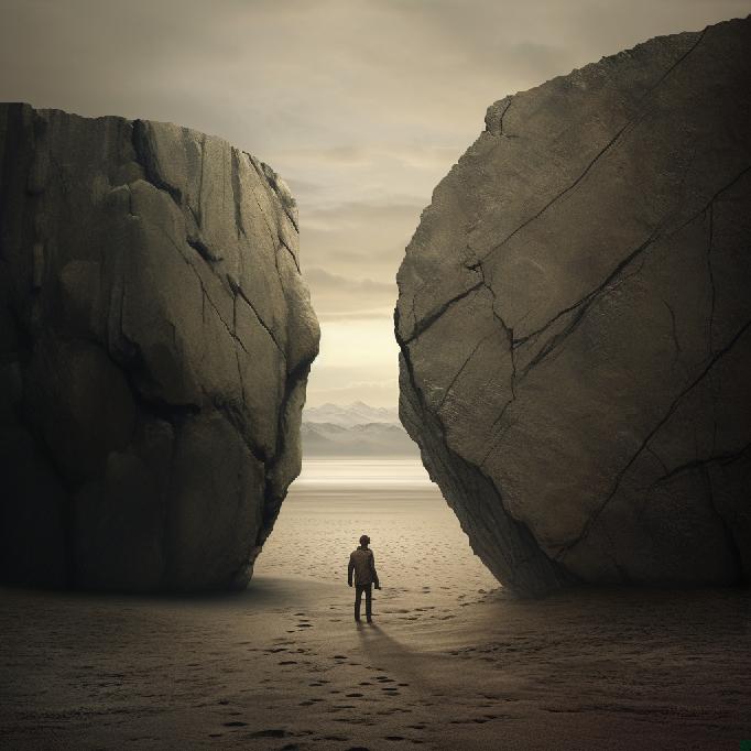 I was feeling stuck at work. So, I opened Midjourney and typed in “stuck between a rock and a hard place” … not knowing what to expect. I was just venting to/at/with MJ. But the results caught my attention. So, I re-ran the prompt, and Midjourney did not waver conceptually. The two sets (of four each) are below.