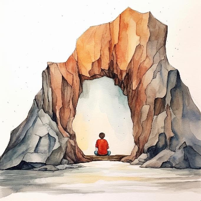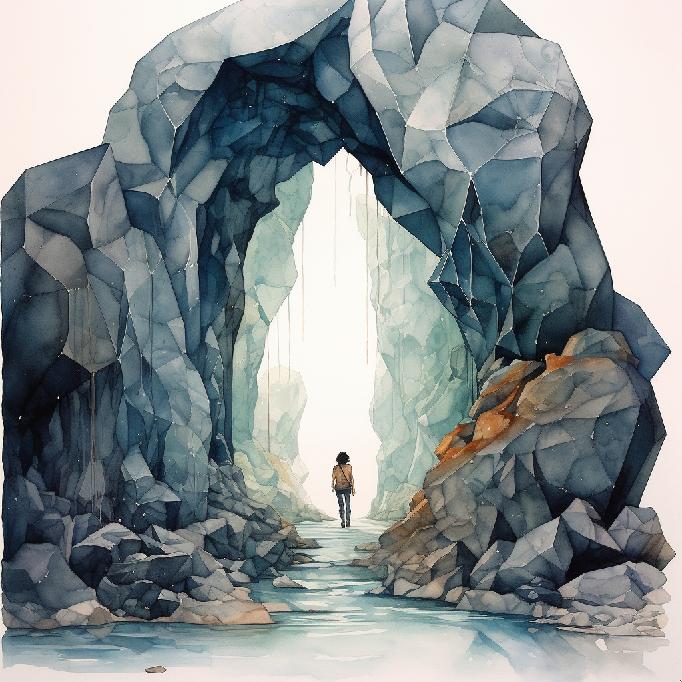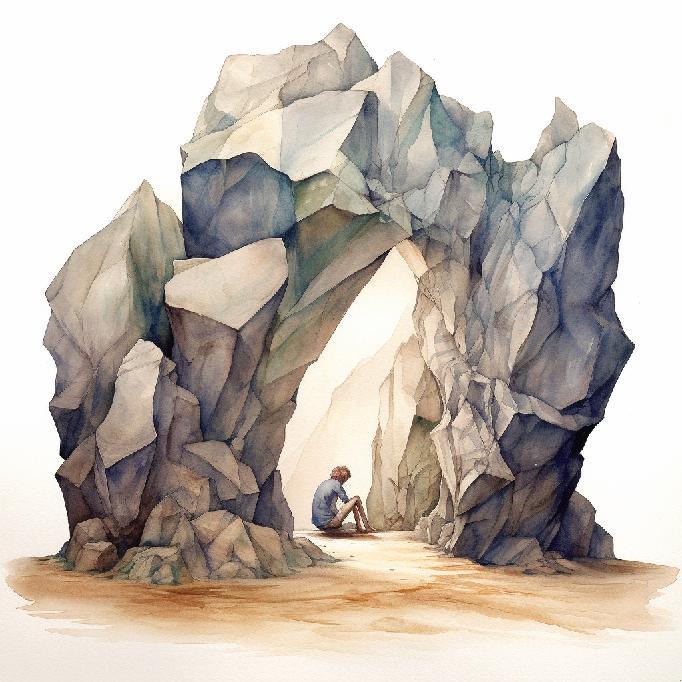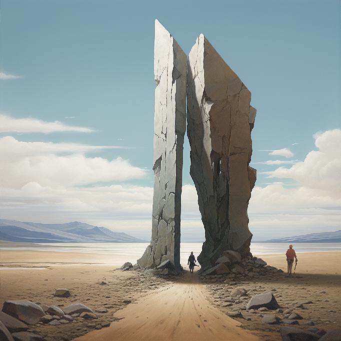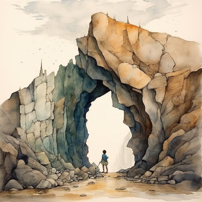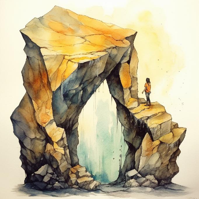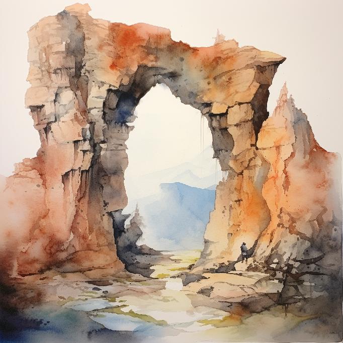 It’s looking like MJ retained the concept elements of the prompt, at least the way it understood it. Open landscapes, one/two people, monolithic rocks (again, one or two), and in one of them the human is in the middle. This set has two more “rock arches” than the previous set. But aside from the “watercolors” styling, the core concepts stuck — so to speak.