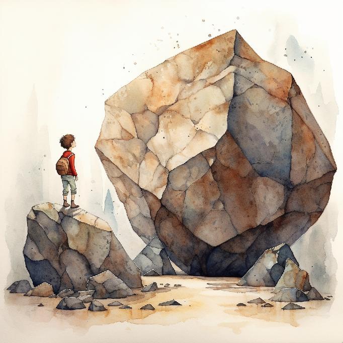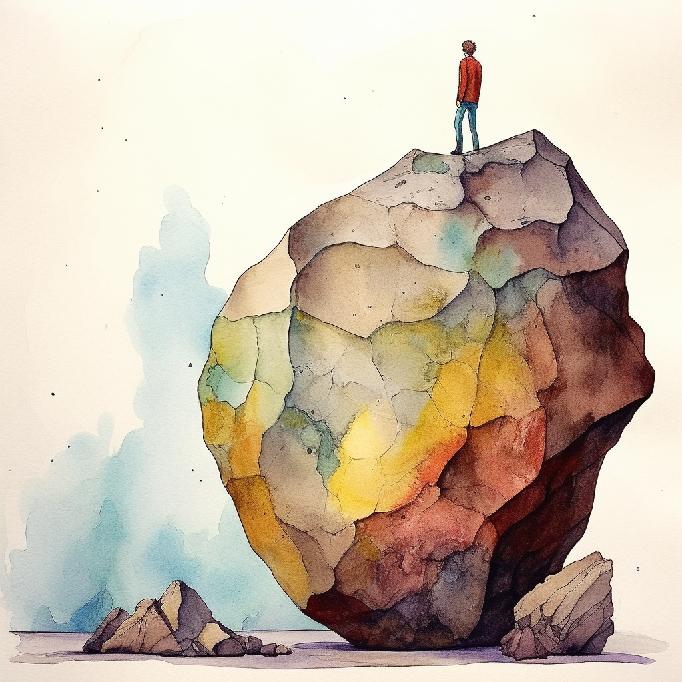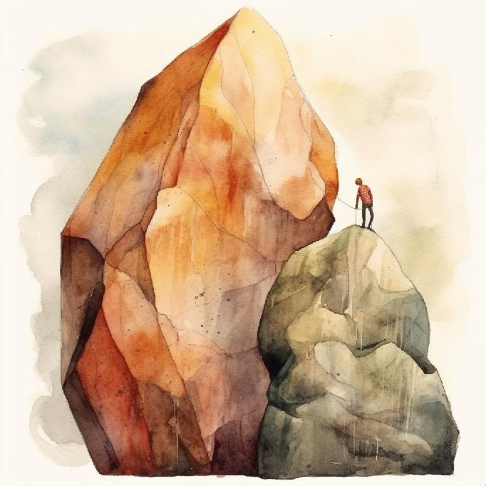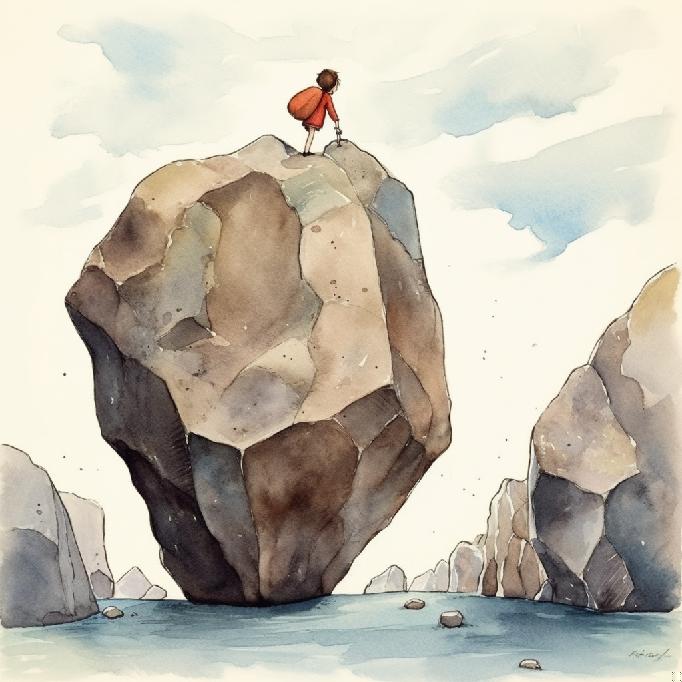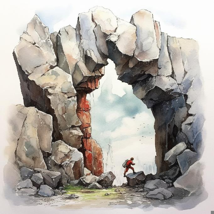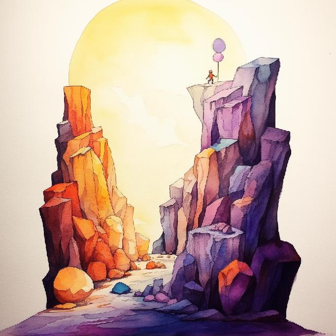 Given that MJ did not waver too much in its conceptual interpretation of the previous prompts, I tried just “between a rock and a hard place” to see what happens; and its watercolors equivalent: “between a rock and a hard place. Watercolors.”