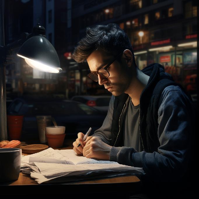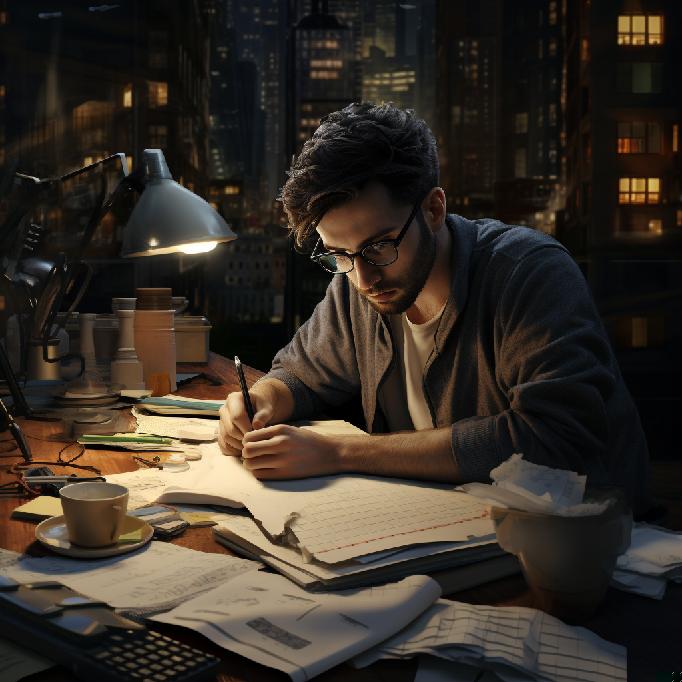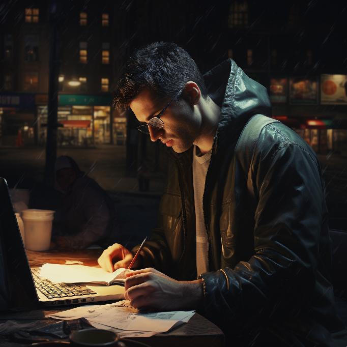“A journalist, toiling away in the middle of the night, researching a story; focused, determined, pursuing a path towards truth. 4K. Photorealism.”