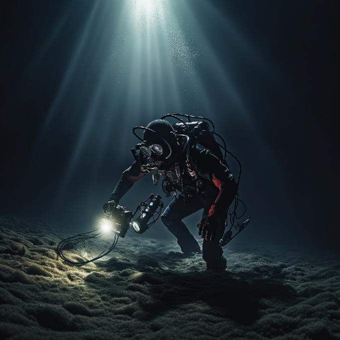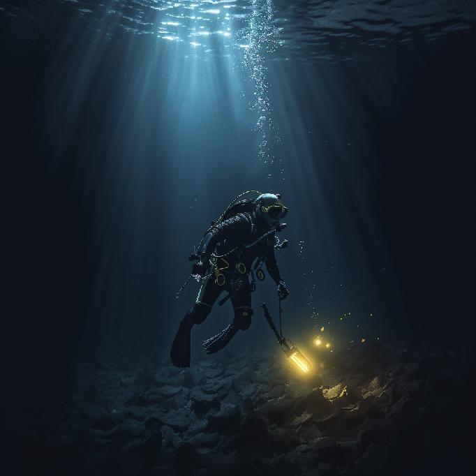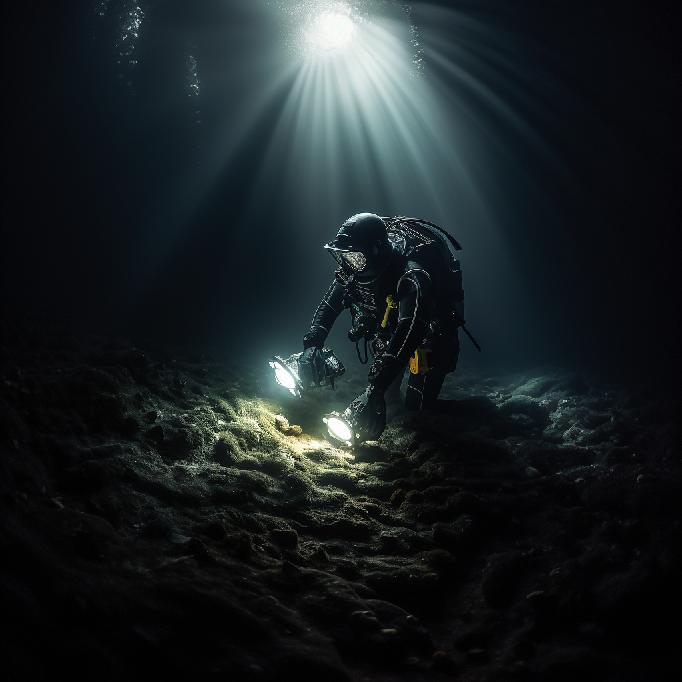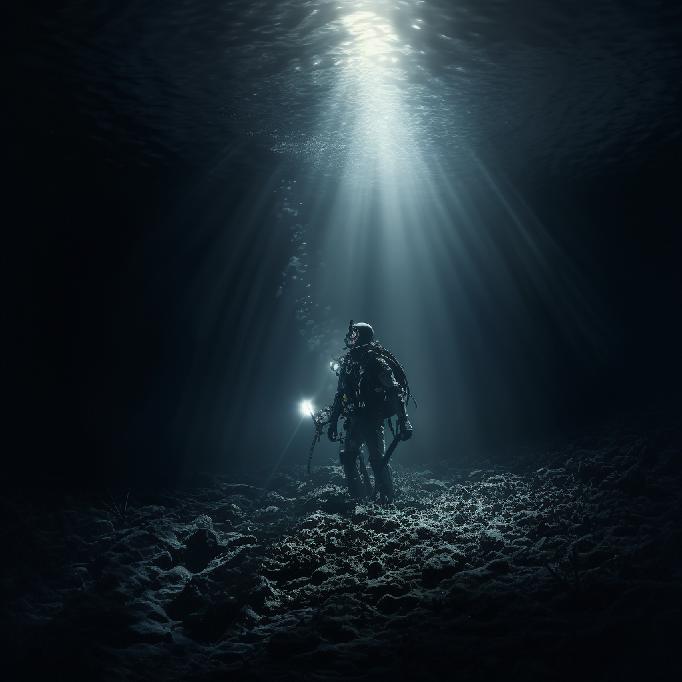 “a scuba diver, walking on the floor of a deep dark ocean, searching for something. Water all around. Everything is dark. The diver’s flashlight guides the search on the ocean floor. 4K. Photorealism.”