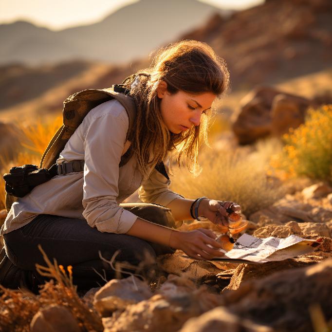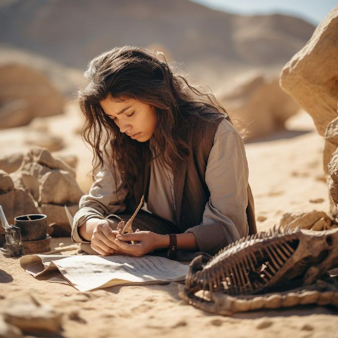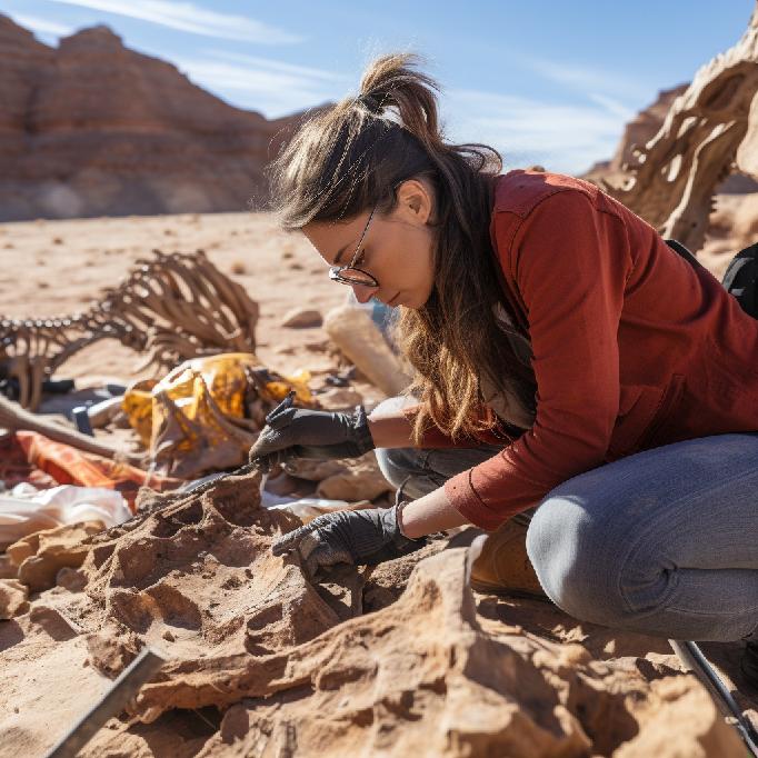 “an archeologist, at an archeological dig, studying fossilized remains of a dinosaur in a rocky desert that she discovered.”