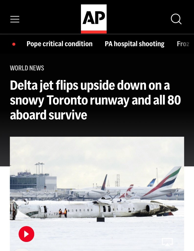 Feb 18, 2025 report by AP: “Delta jet flips upside down on a snowy Toronto runway and all 80 aboard survive”