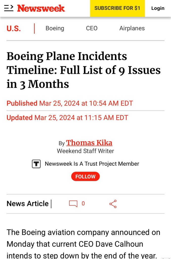 The reputation bears in realities. Here is a Newsweek report from back in March 2024 about 9 different aircraft incidents involving a Boeing plane in the first three months of 2024: