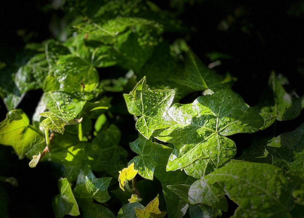 Saw this on my way to work one morning. It had rained all of the night before, but the Sun came out swinging in the morning. And the results were these brightly lit drops of water on this lush green patch of leaves.