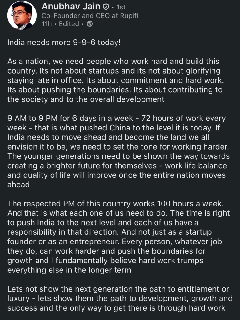 I will say … these CEOs are getting creative with their grift. They are now spinning longer/harder periods of work as a selfless act of patriotism for the nation (in this case, India). It’s an idiotic thought.