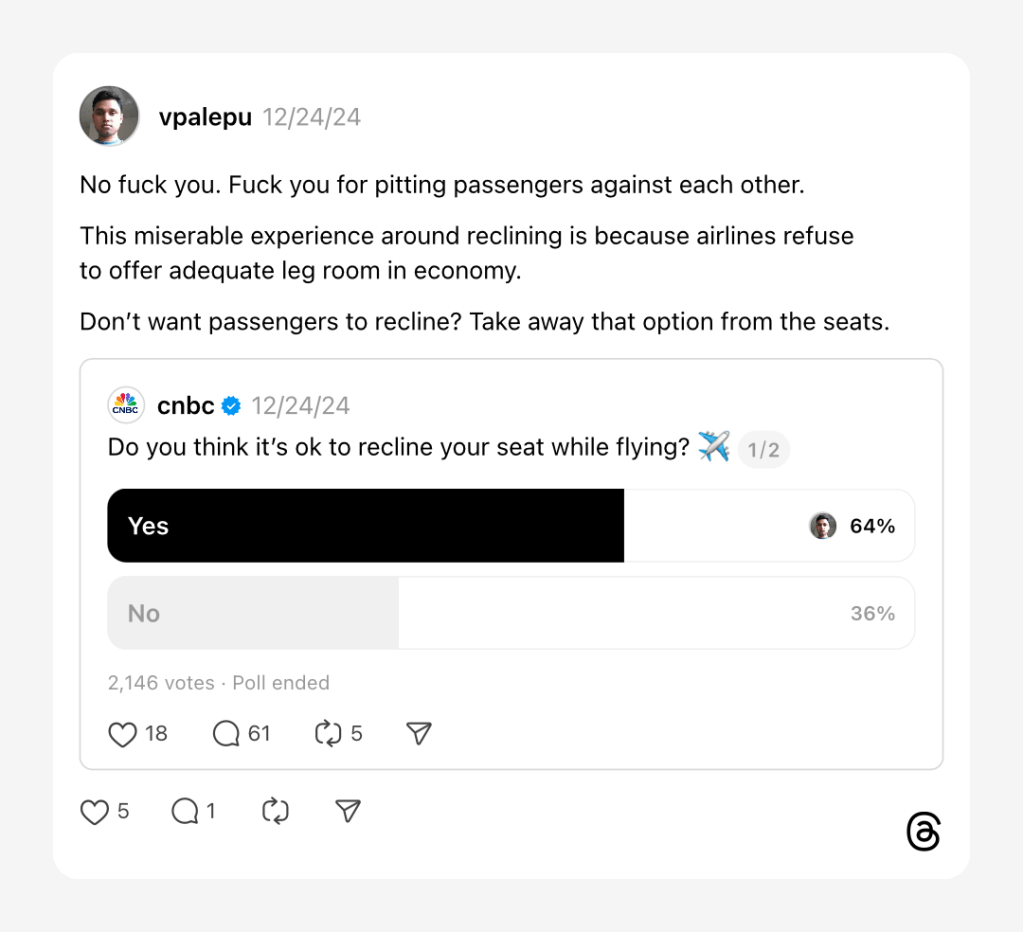 Airliners profit at the expense of passengers’ dignity – they need to remember that, and remind themselves of that constantly. Passengers already factor in a lot of indignity when they travel. But when certain lines get crossed, passengers will have very limited tolerance. And the bar for airlines to clear is very low: the flight needs to take off, land, and remain intact.