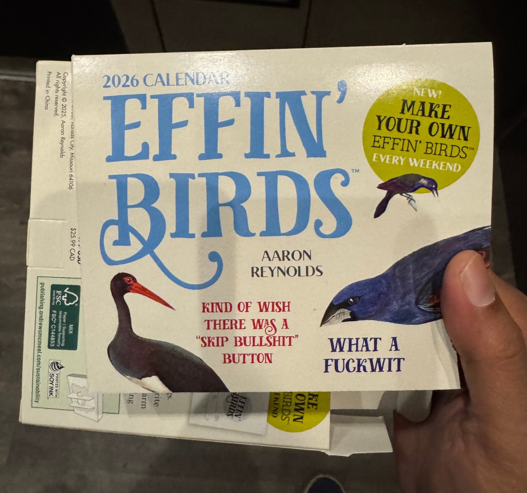 π¦ Effin’ Birds by Aaron Reynolds is perhaps the wittiest, no-holds-barred, internet comic that I have come across. It is a great play on “flipping the bird”. Certainly not for everyone (my wife does not find the humor in this π). But it carried me through some low points in 2025. I got the comic’s 2026 calendar and it does not disappoint. Aaron’s found lightning in a bottle by mixing curse words and beautiful illustrations of birds.